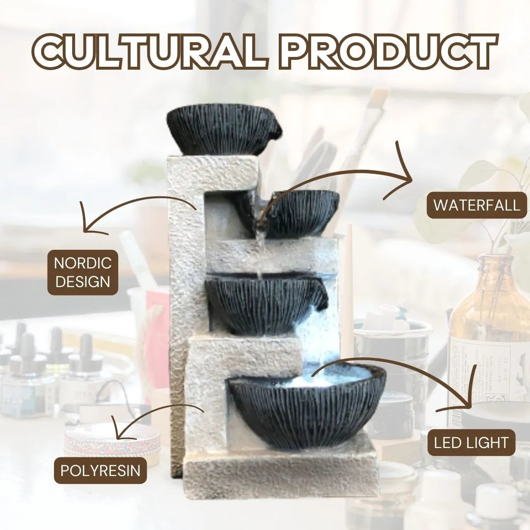 Water gently cascades from the top bowl down through three more tiers, creating a rhythmic trickle that soothes the senses. The layered flow enhances the design’s vertical dimension while producing a continuous, tranquil sound — perfect for relaxation, meditation, or simply enjoying a quiet moment in your space.