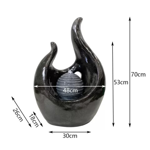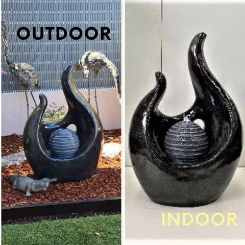 This fountain doubles as an art piece. Its sweeping, flame-like silhouette evokes movement and energy even while still, bringing a sense of fluid sculpture to your space. The central orb is designed to contrast in both form and texture—its smooth, ribbed surface highlighted by gentle water flow. Whether placed in a modern garden, balcony, or contemporary patio, this piece demands attention and admiration while seamlessly integrating with design-led décor.