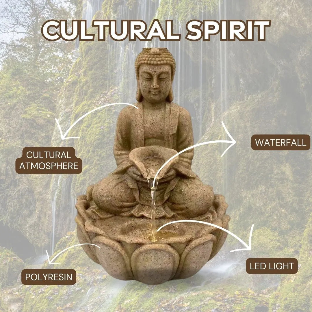 The highlight of this water feature is the soothing water flow that cascades gently from the lotus-shaped bowl held in the Buddha’s hands. The rainfall-style trickle creates a peaceful, ambient sound reminiscent of natural streams, promoting mindfulness and reducing stress. This serene waterfall effect enhances the spiritual symbolism of the Buddha, making it a meaningful centerpiece for any setting.