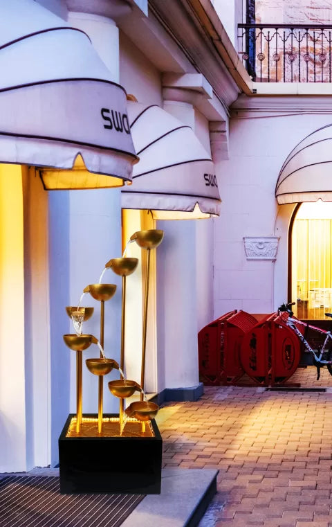 Crafted from durable galvanised iron, the fountain is finished in a lustrous gold-copper hue that radiates warmth and luxury. The corrosion-resistant construction ensures long-lasting quality in both indoor and sheltered outdoor environments, while the gleaming metal catches and reflects light for a dynamic, ever-changing look.