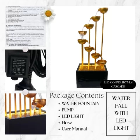The Cascading Copper Bowls LED Lighting Water Fountain brings together modern artistry, functional tranquility, and luminous warmth. Whether placed in a garden alcove or a luxury lobby, this piece delivers elegant movement and golden charm that captivates by day and mesmerizes by night.
