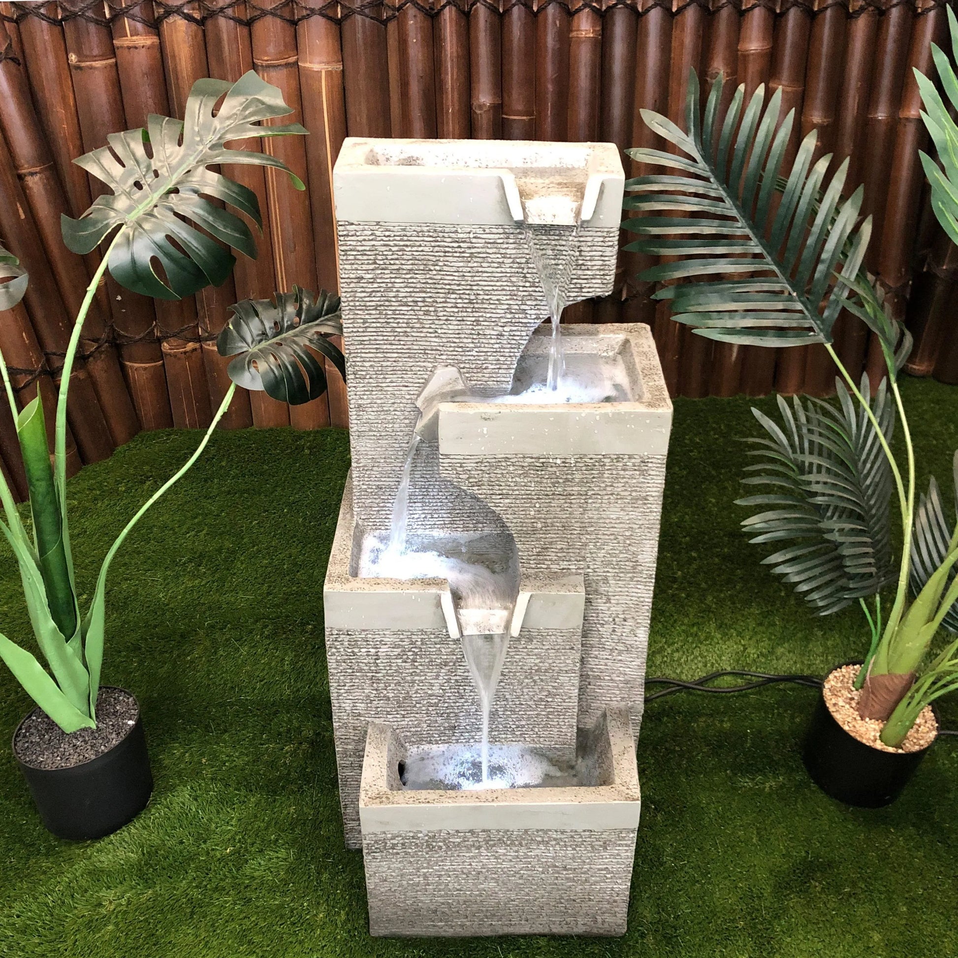 The Modern 4 Tier Stone Look LED Light Water Fountain is a bold, structured water feature that combines contemporary form with the peaceful ambience of flowing water. Designed to be a standout piece in any interior or sheltered outdoor space, this fountain measures 36.5cm wide, 36cm deep, and 81cm high, offering a commanding vertical presence while maintaining a refined and minimalist aesthetic.