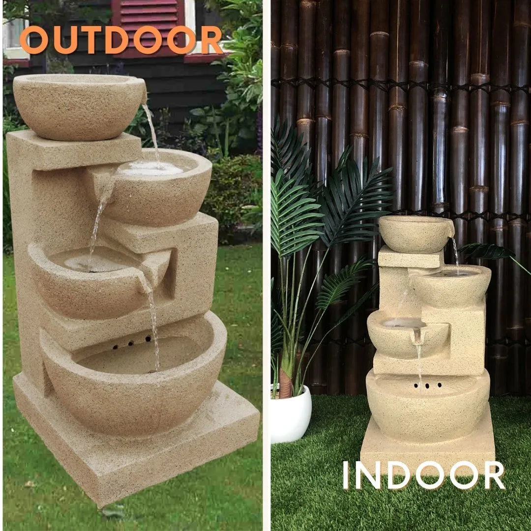 Crafted to resemble chiselled sandstone, the fountain’s textured finish and neutral tones seamlessly blend into garden beds, courtyards, or patios. Its stacked bowl design delivers a rustic yet contemporary look, combining structure with the softness of natural form. Each tier is artfully aligned to create balance and flow—making it a statement piece that doesn’t overwhelm its space.