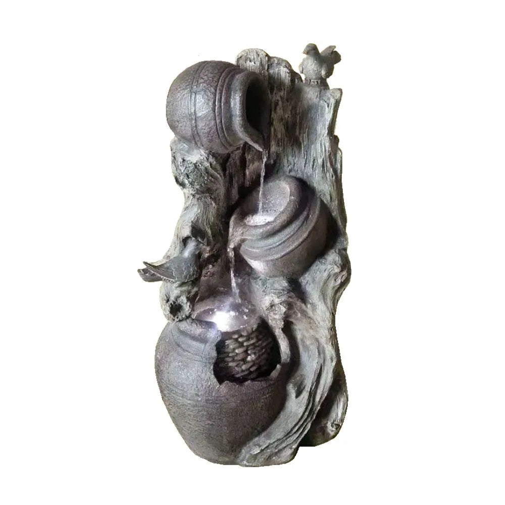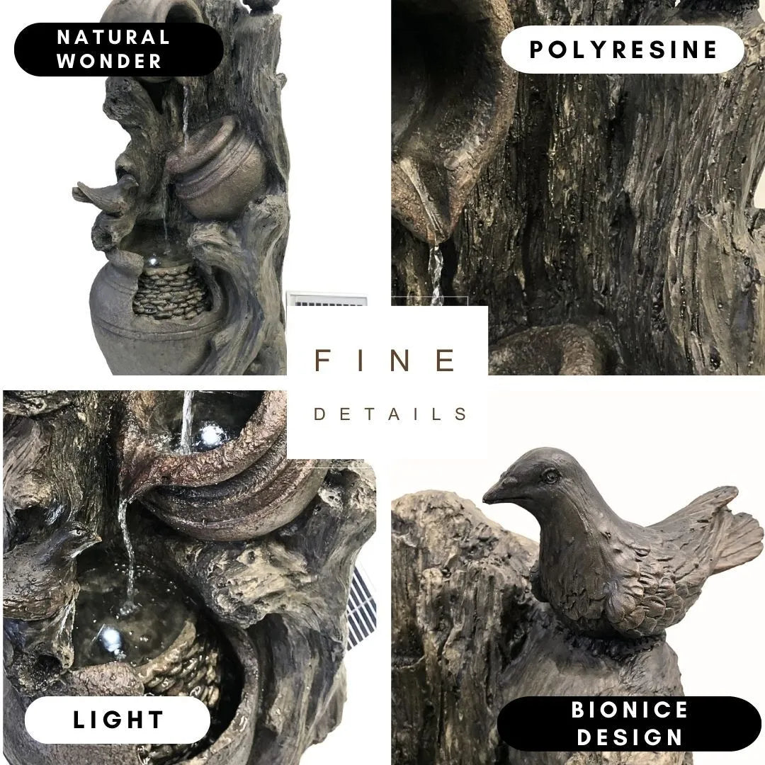 Featuring intricately sculpted urns nestled within a driftwood-style frame, this fountain evokes the warmth and texture of handcrafted garden décor. The organic lines and weathered finish give it a lived-in, natural look that complements cottage gardens, woodland paths, or traditional patio settings. Every curve tells a story of rustic heritage.