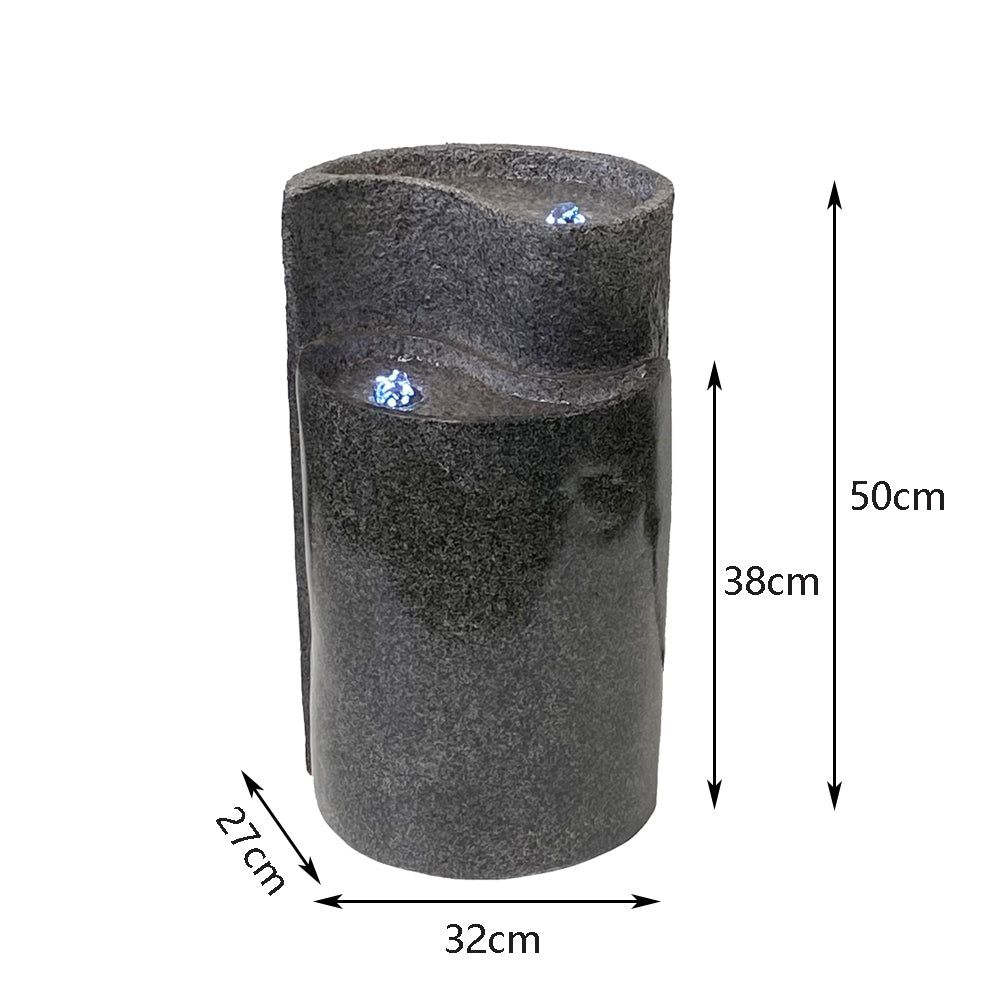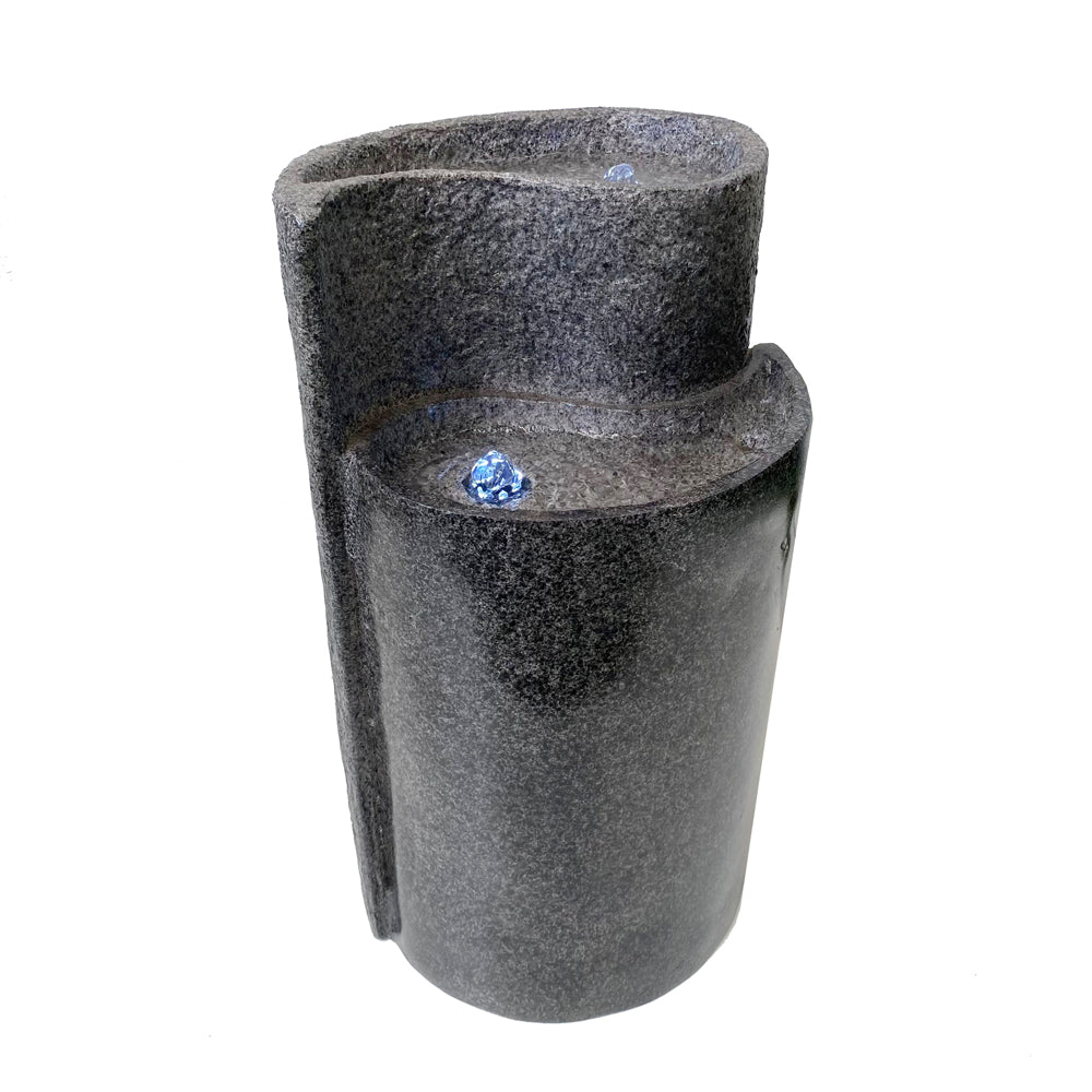 Water gently bubbles up and flows between two offset pools, delivering both a soothing visual and a calming ambient sound. Illuminated by soft white LED lighting, each pool glows with gentle radiance, making it equally striking in both daylight and low-light conditions. The subtle motion and glow draw attention without overpowering your space.