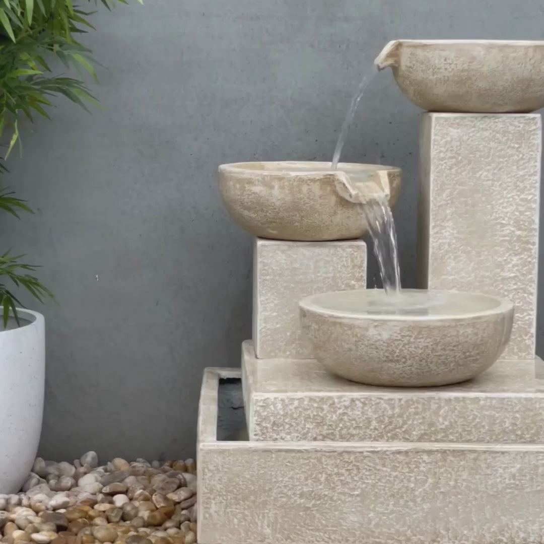 Water gently cascades from the upper bowl through each tier, producing a continuous flow that adds movement, sound, and serenity to your outdoor space. The soft rhythm of cascading water creates a calming ambience, making the Trio Fountain ideal for moments of quiet reflection as well as enhancing the atmosphere of entertaining areas.